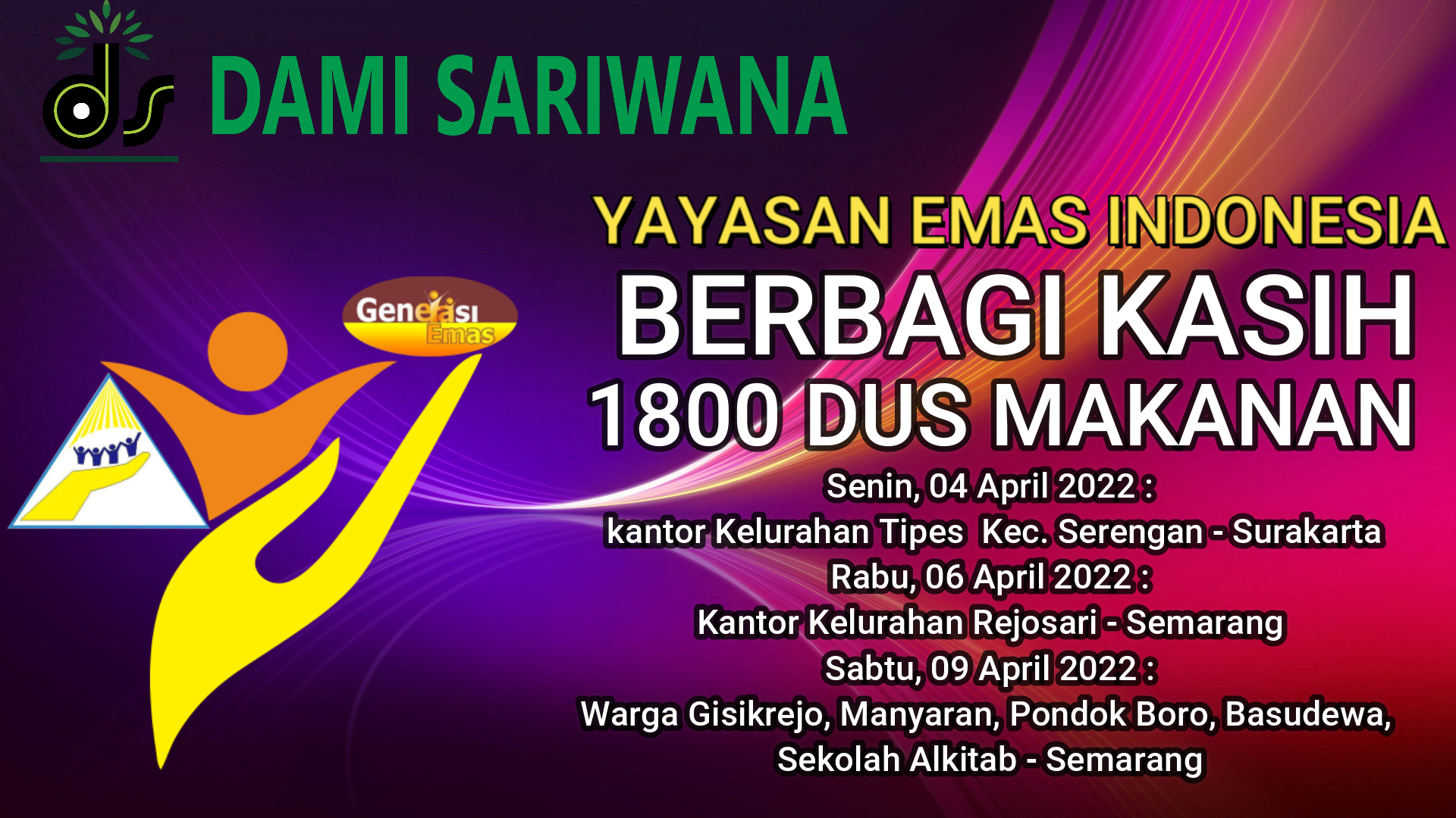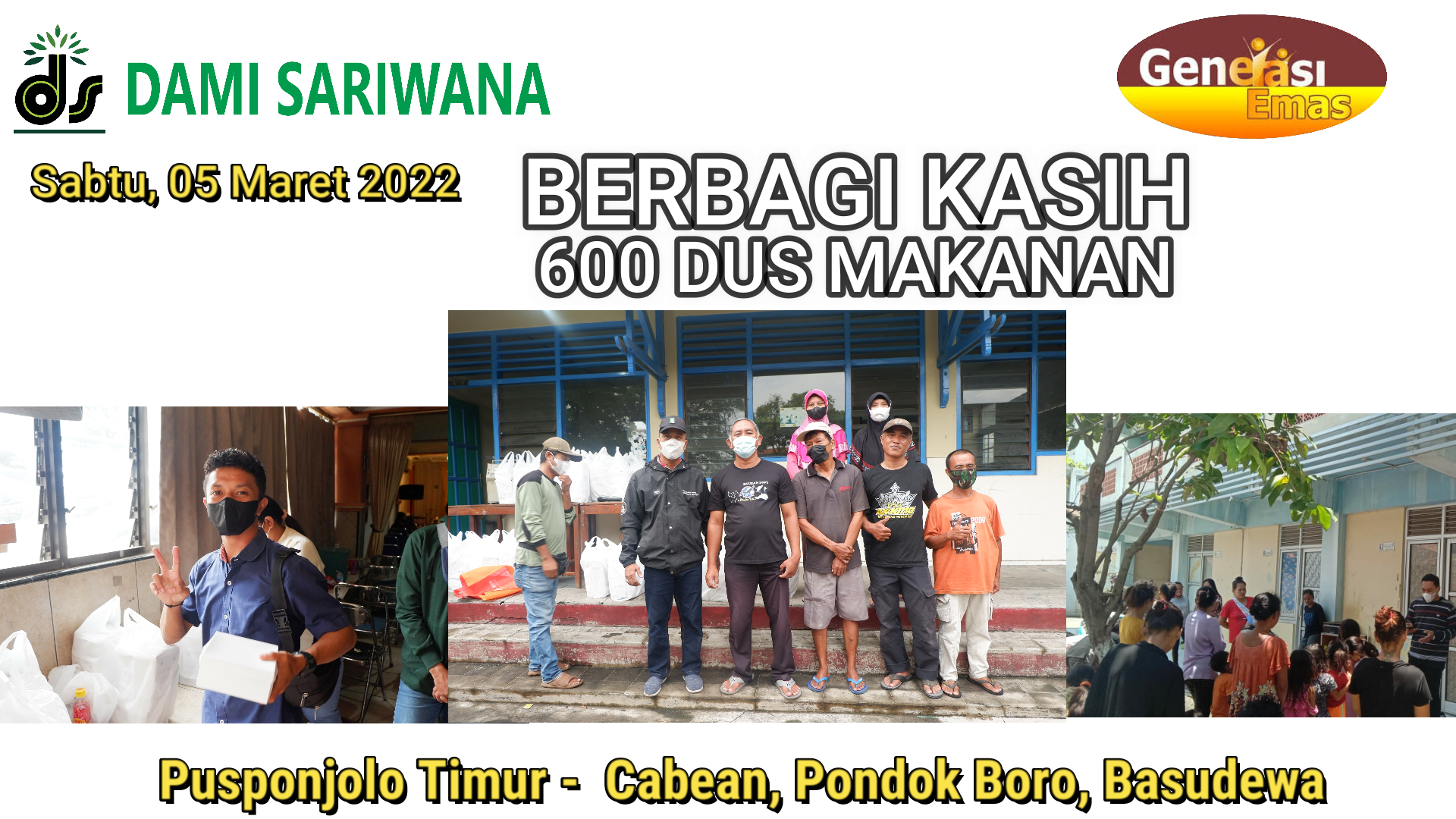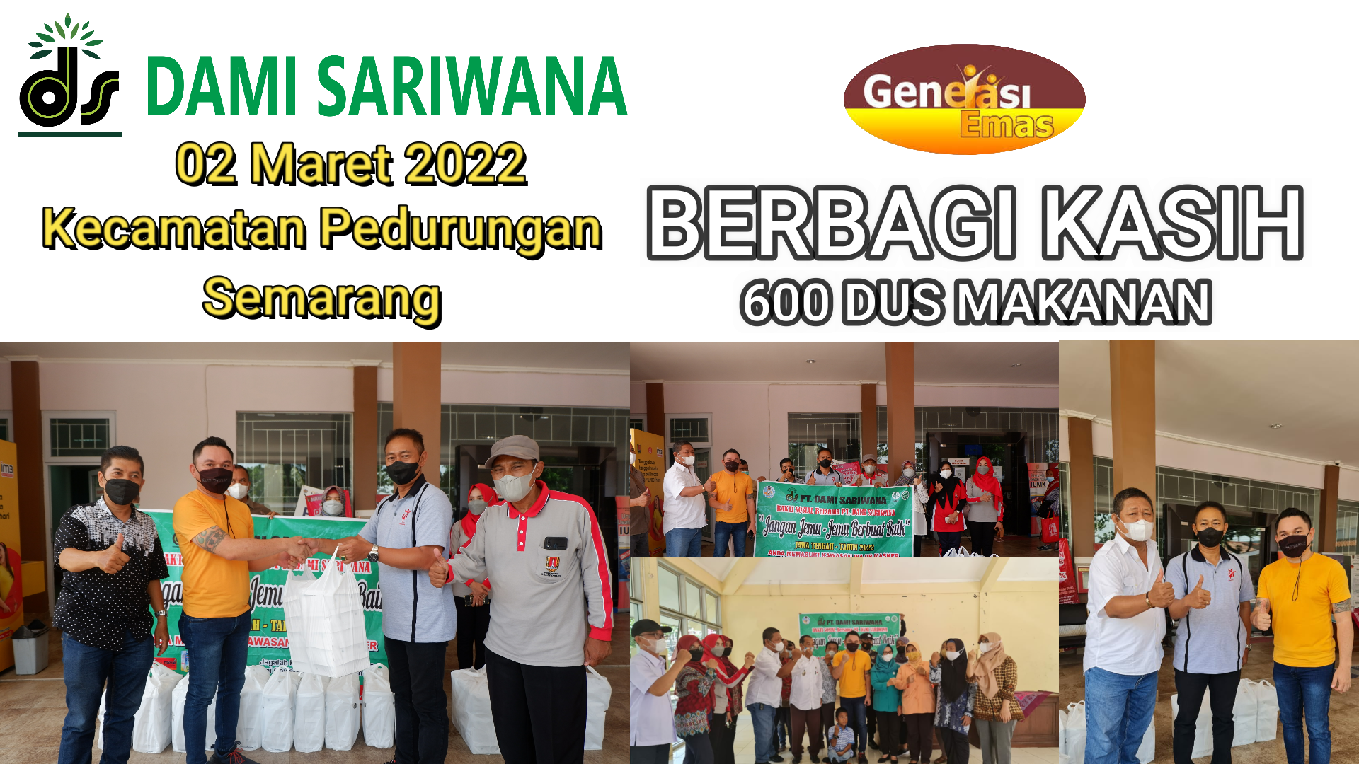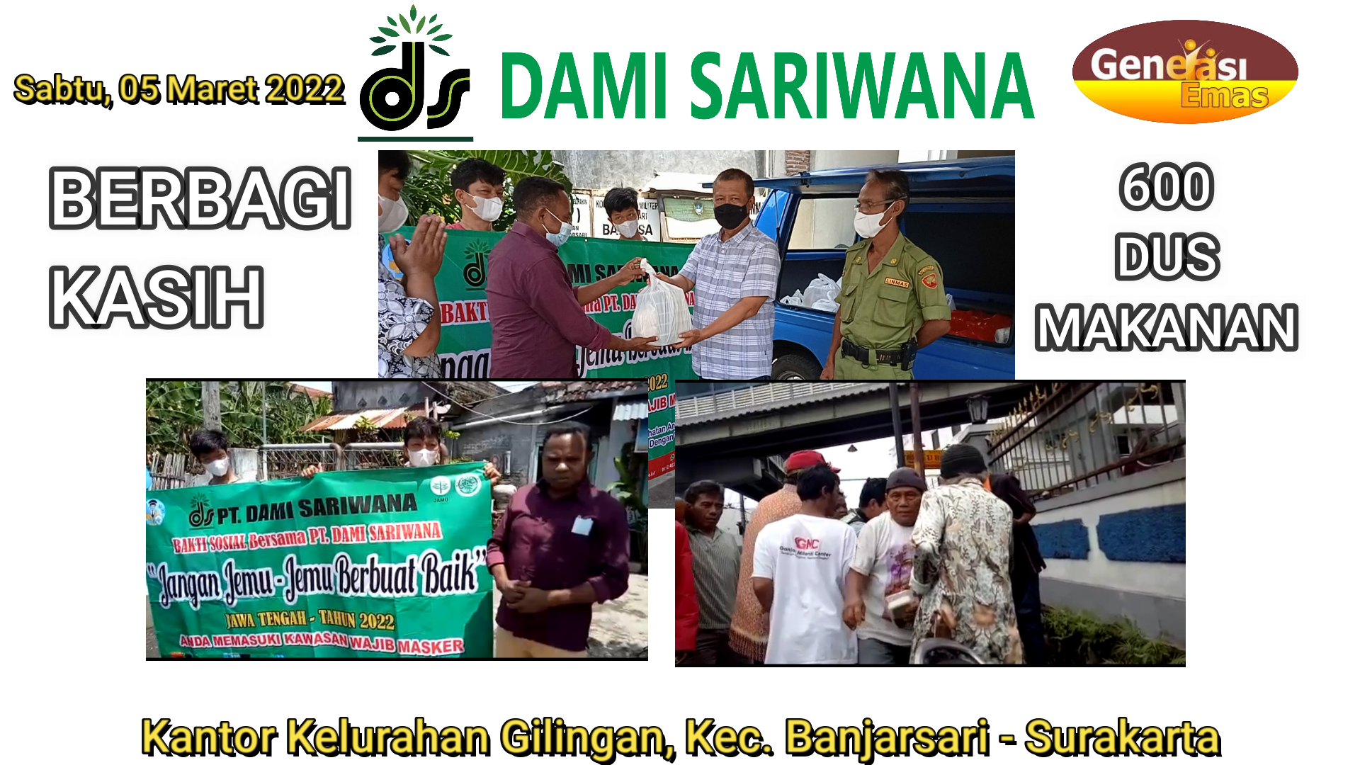 Yayasan Emas indonesia Cabang Solo Berbagi Kasih 600 Dus makanan pada hari Sabtu, 26 Februari 2022 di desa Munggung, RT 01/04 Kel. Gilingan, Kec. Banjarsari - Surakarta, Pada hari senin, 28 Februari 2022 di desa Blibis, RT 03/24, Kel. Nusukan, Kec. Banjarsari - Surakarta